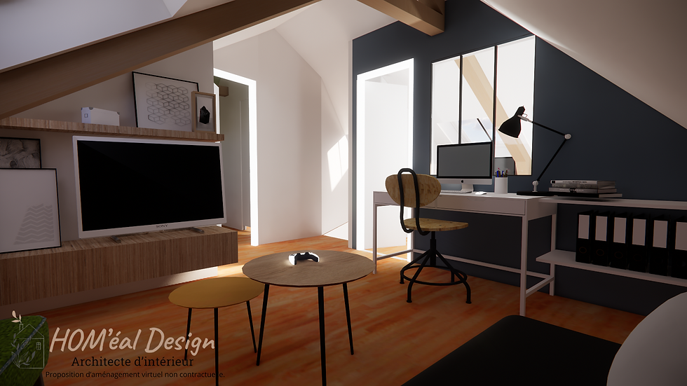 Ce projet a été mené à distance depuis la Normandie. Mon client souhaitait réaménager le dernier étage de sa maison afin d'y créer une chambre avec salle de douche attenante, un palier, et un bureau double espaces de travail. 💻 Le projection 3D a pu mettre en évidence des problèmes techniques dans sa disposition initiale, je lui ai bien évidement proposer des solutions.