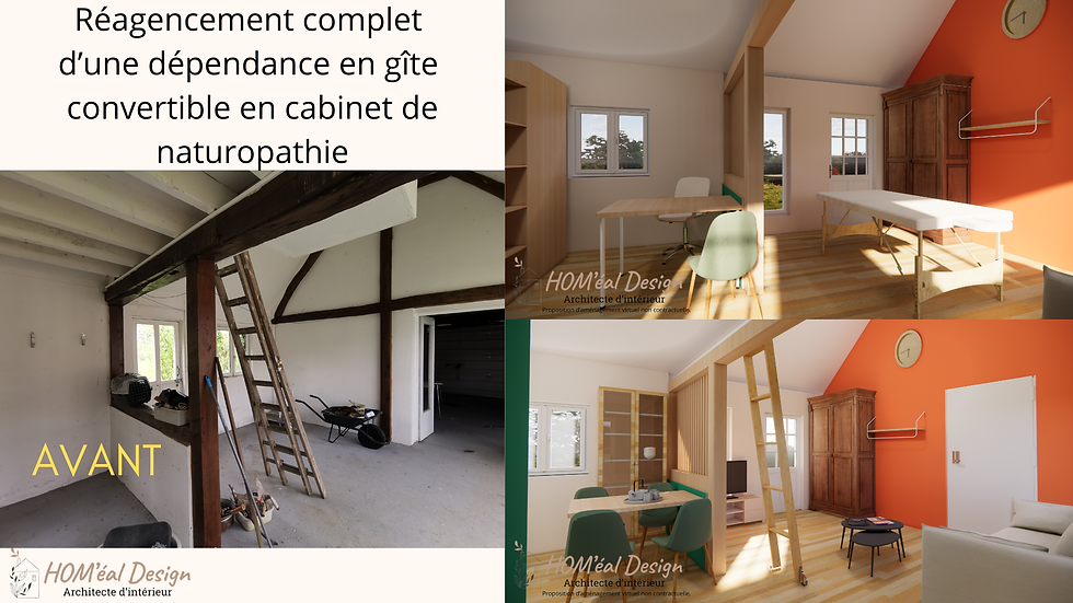 Enfin plutôt deux projets en un; Ce studio devait pouvoir accueillir le cabinet de naturopathie de ma cliente et se transformer facilement en location de court séjour.